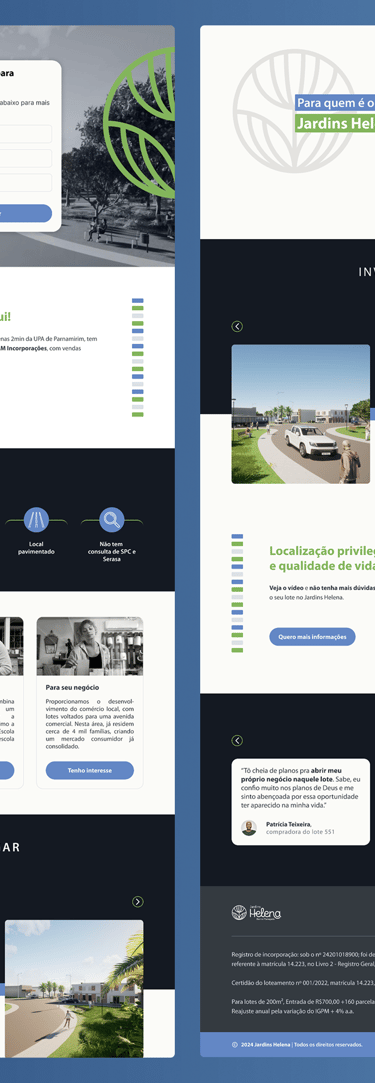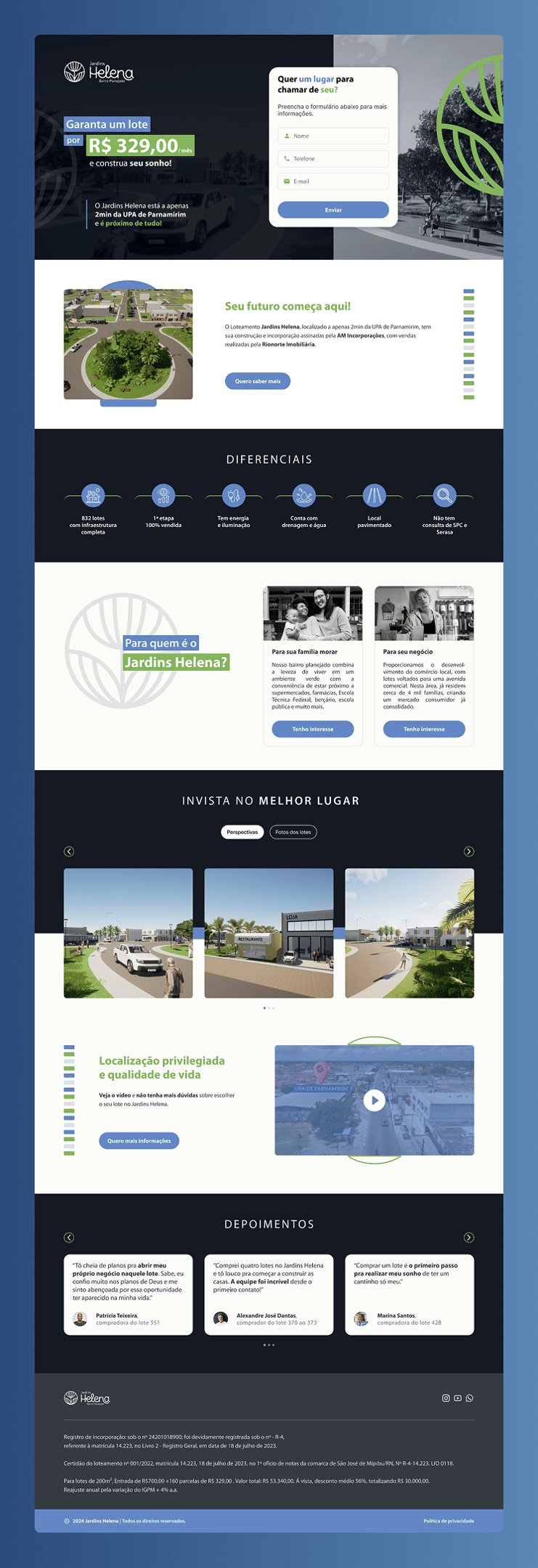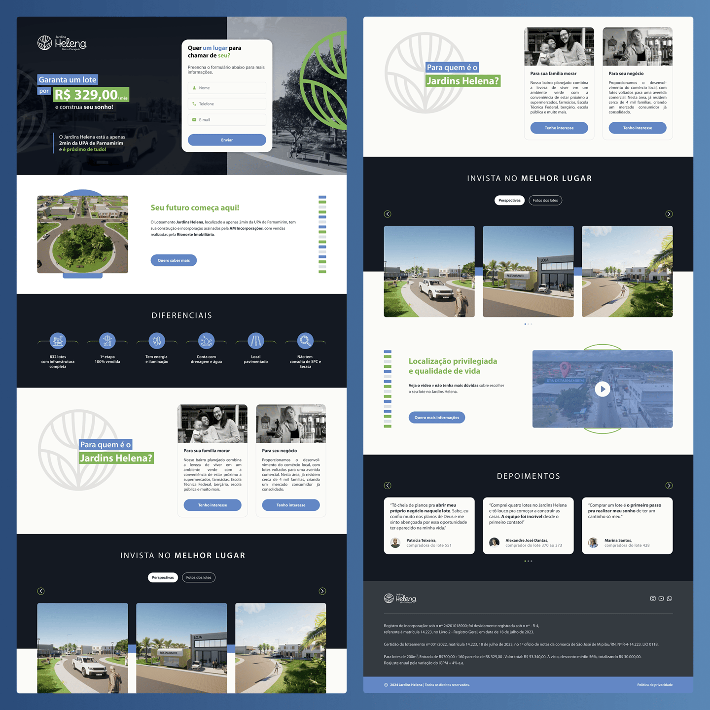 O Jardins Helena é um empreendimento residencial de alto padrão localizado em Maceió/AL, planejado para oferecer qualidade de vida, contato com a natureza e segurança aos seus moradores. Com o objetivo de otimizar a captação de interessados e apresentar de forma estratégica os diferenciais do loteamento, desenvolvi uma landing page focada em evidenciar os atributos exclusivos do empreendimento e facilitar o contato com potenciais clientes.
